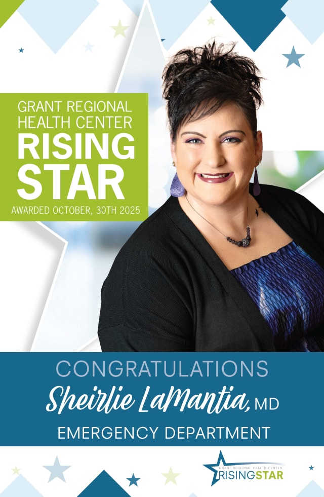 Each quarter, Grant Regional Health Center recognizes outstanding employees through the Rising Star program. For the third quarter of 2025, Sheirlie LaMantia, MD, has received this distinguished recognition. To achieve this honor, the program’s nominees personify the remarkable patient experience and Grant Regional Health Center Values of Respect, Integrity, Professionalism, Community-Minded, Commitment, and Progressive.